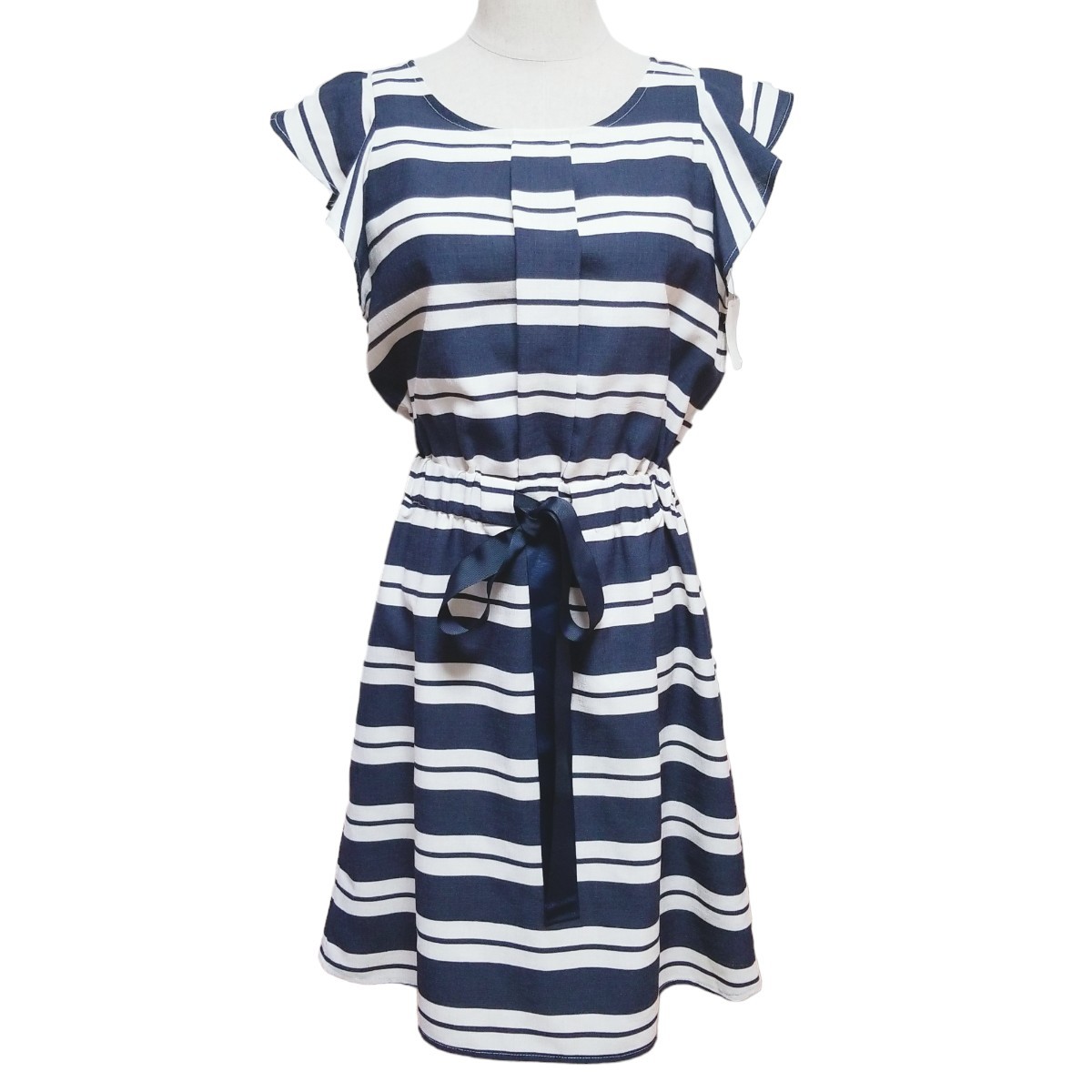 - Y879 新品 未使用 タグ付★定価6,490円 Rio リオ ひざ丈ワンピース フリル袖 ウエストゴム リボン付き M ネイビー×ホワイト ボーダー