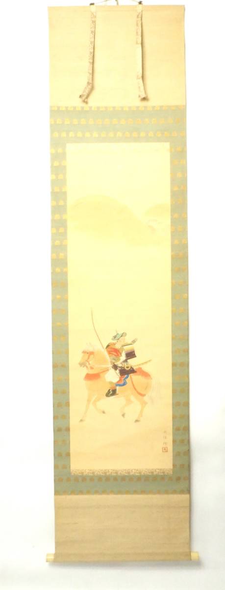 - 昭和ビンテージ『馬上武者の図』日本画 絹本掛軸 在銘品 落款有 箱無し 長さ198cm 幅49cm TNI510