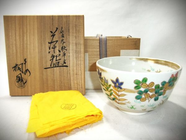 - 【睦】「仁清写秋草文」平安「桐鳳」勧修寺窯 茶道具 抹茶茶碗 美品 未使用 共布 共箱■