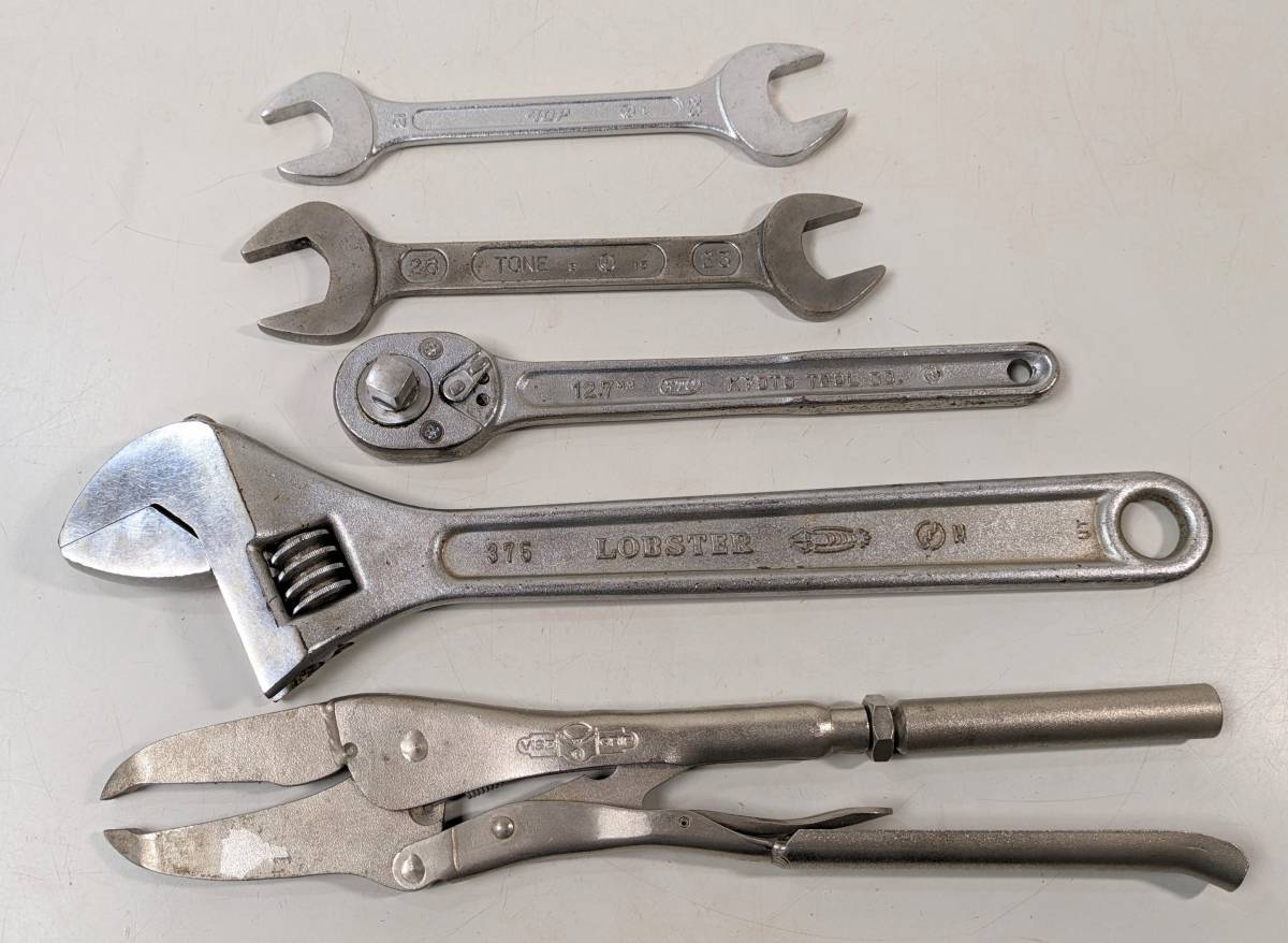 - ★ピーターセン ロングノーズ ロッキングプライヤー★ロブテック 強力型モンキー★KTC ラチェット★TONE・TOP 両口スパナ★中古5品★
