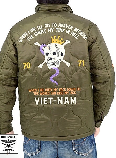 - ナイロンリップベトナムジャケット「SKULL」 ◆HOUSTON オリーブXLサイズ 51266 ヒューストン 刺繍 和柄 和風 骸骨 ドクロ ベトジャン
