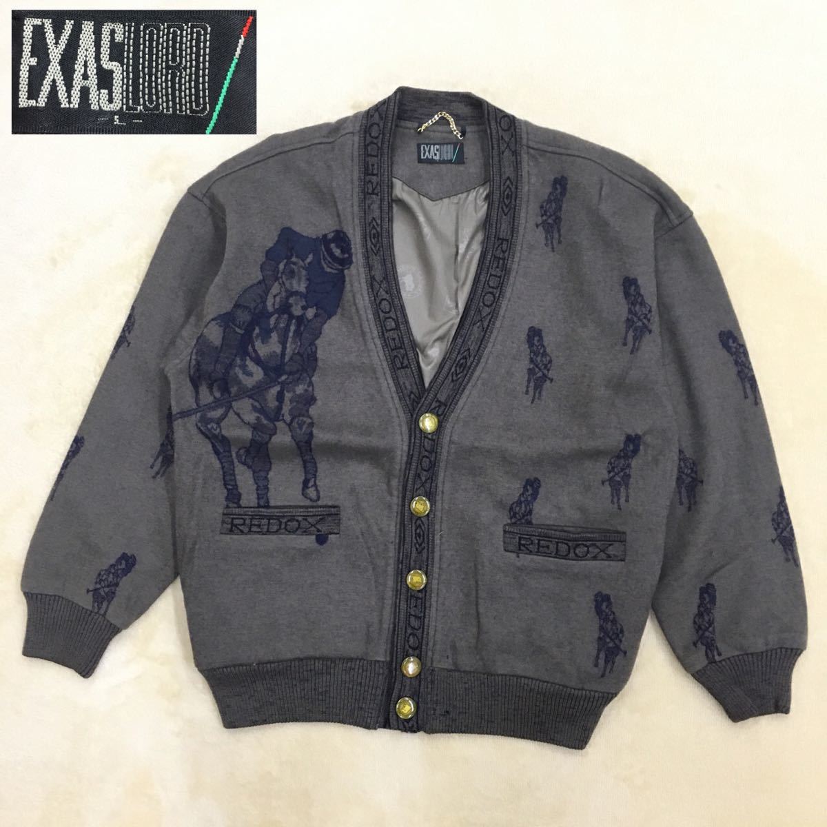 - EXASLORO ヴィンテージ カーディガン ジャケット ウール ポロ スポーツ総柄 総裏 メタルボタン レトロデザイン メンズ サイズL