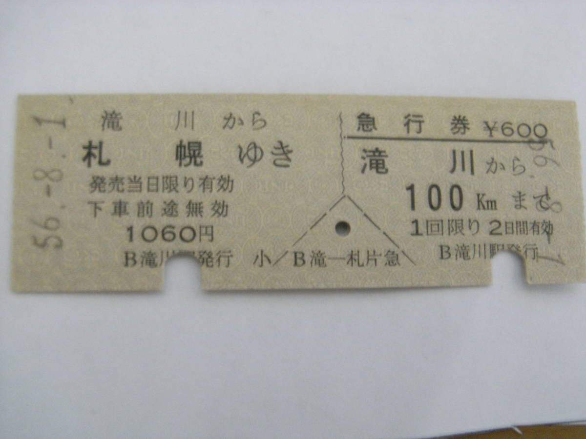 - 函館本線 滝川から札幌ゆき/急行券 滝川から100kmまで 昭和56年8月1日 滝川駅発行