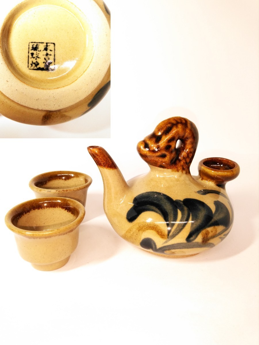 - 琉球焼 末吉窯 酒器セット カラカラ やちむん 徳利 酒杯 酒盃 泡盛 工芸品 道具 注器 美品 在銘 (検索) ハブ 沖縄 日本酒 燗器 古玩