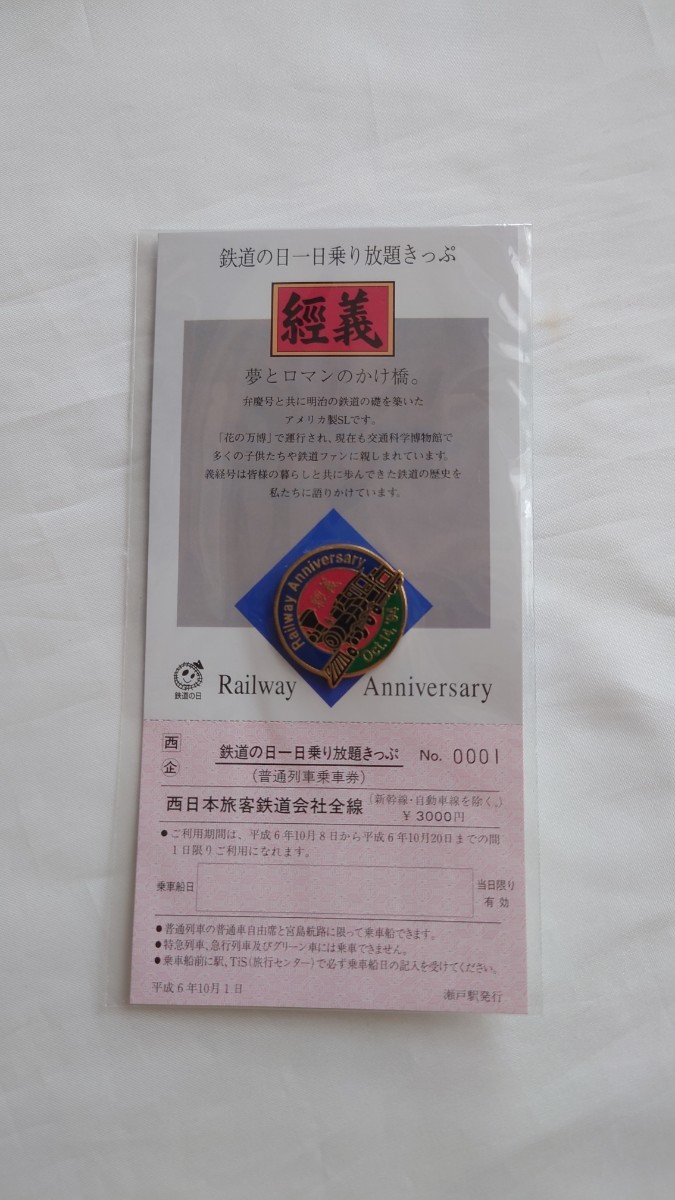 - △JR西日本No.0001△鉄道の日一日乗り放題きっぷ平成6年△義経号ピンバッジ付