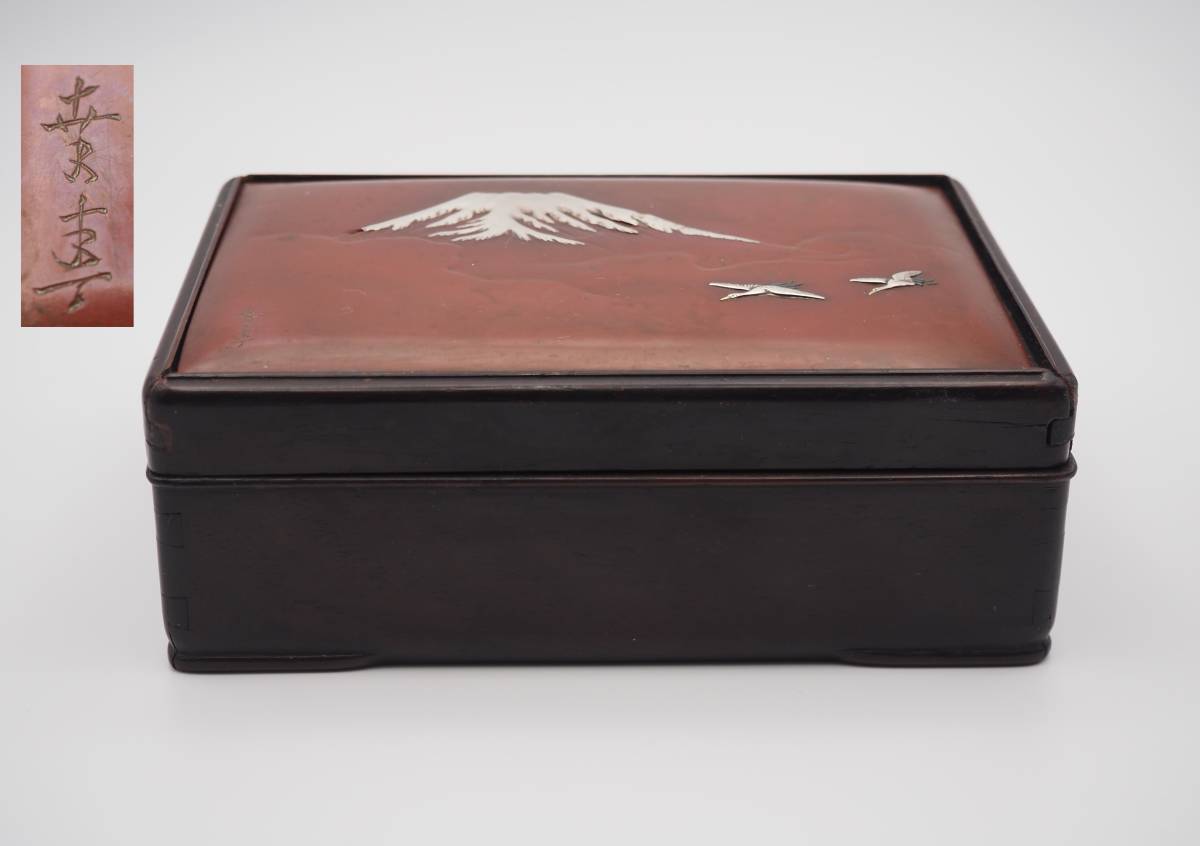 - 明治期 紫檀 銅製 富士山 鶴 文箱/小物入れ 在銘