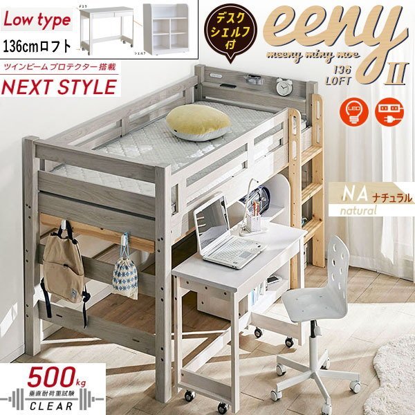> ロフトベッド イーニー2 業務用 高136cm 幅90cmデスク 幅60cmシェルフ 3点セット WH-NA ホワイト ナチュラル 送料無料 耐荷重
