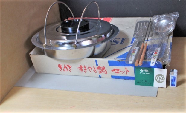 > 改■ み-571 すきやき 鍋 セット 未使用 フチ厚1.5cm 陶栄堂 保管品 鍋:ステンレス製 箱:高7.5cm 幅43cm 縦32cm 全重量1.68kg