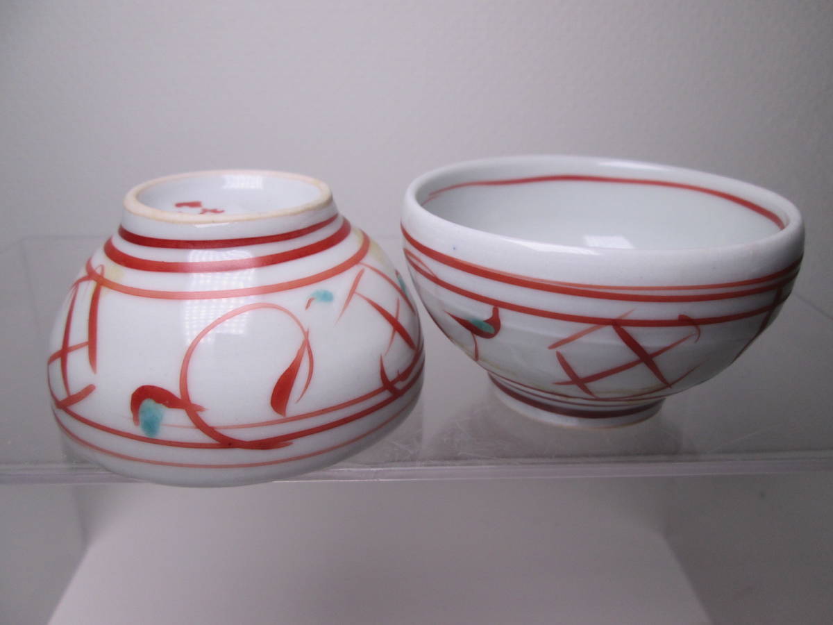 - ☆九谷焼 現代陶芸 人気個展作家 赤地健 赤絵酒盃 2客 箱無 お料理屋さんの器 ぐい呑/酒杯/モダンアート