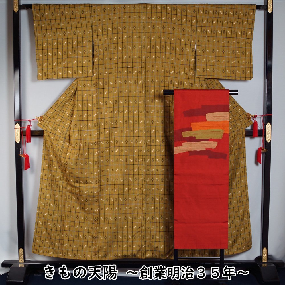 - 着物セット 紬・名古屋帯 2点 セット 格子に絣模様 Sサイズ 紬 正絹 着物 紬 中古 リサイクル着物 京都きもの天陽