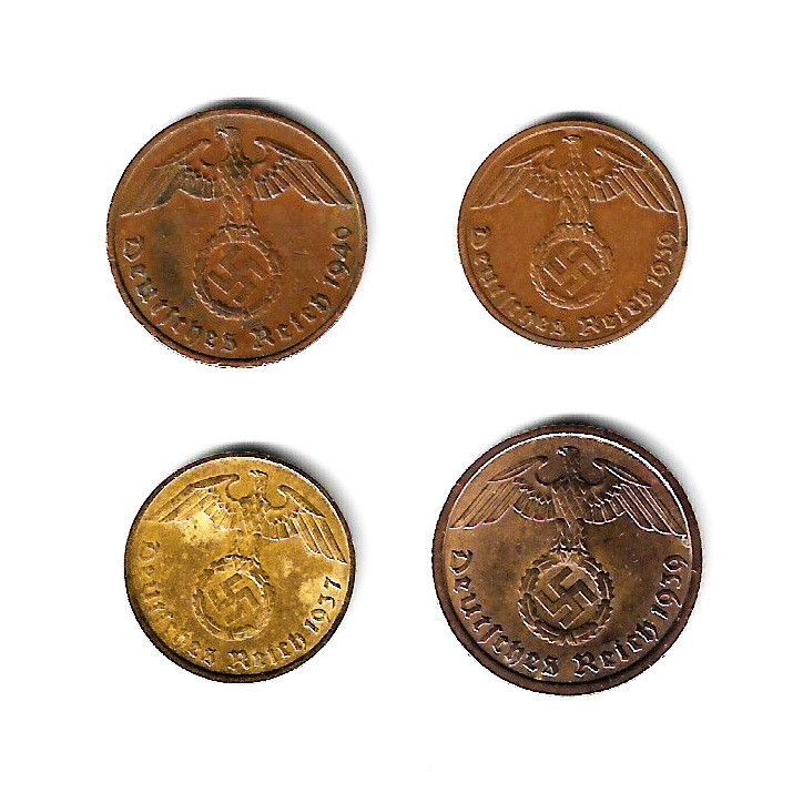 - ドイツ 第三帝国 (鉤十字) - 1, 2, 5, 10 ライヒスペニヒ/青銅貨 黄銅貨★ZD-12