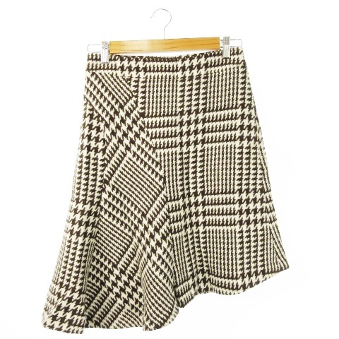 > クミキョク 組曲 KUMIKYOKU スカート フレア ひざ丈 アシンメトリー ヘムライン 変形 ウール アンゴラ混 厚手 千鳥格子 2 茶 ブラウン