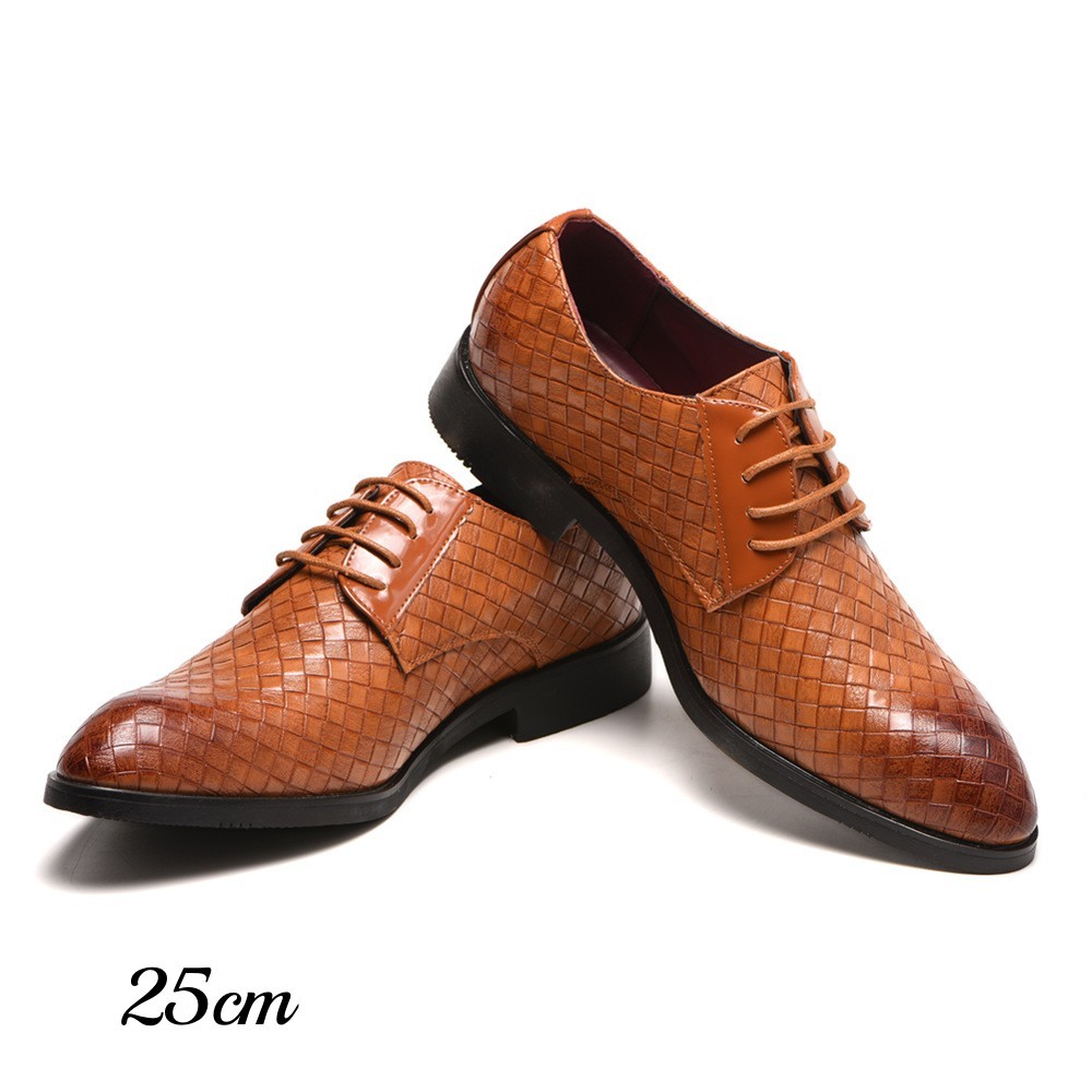 - ☆ビジネスシューズ メンズ シューズ 紐靴 PU革靴 ロングノーズ 編み柄 紳士靴 オシャレ レースアップ ブラウン 25cm