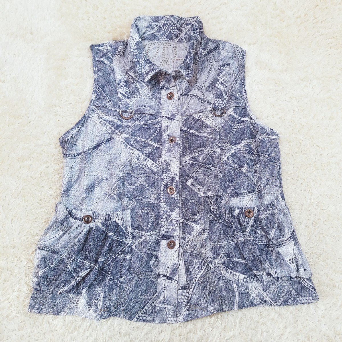 > Y1135 美品★ワイヤー入り襟 レースベスト ノースリーブカットソー ブラウス レディース LL相当 ネイビー系