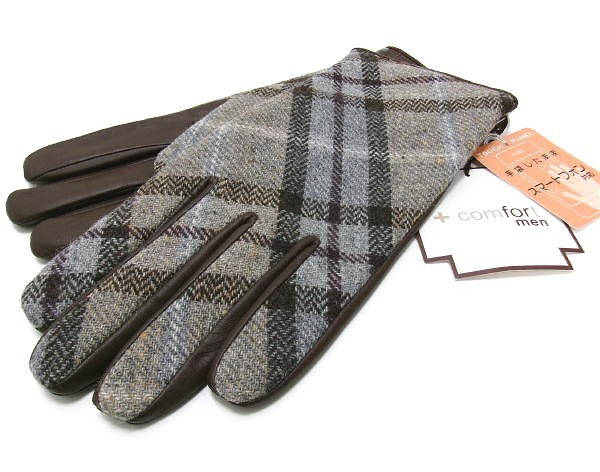 - 新品★+comfort★プラスコンフォート★スマホ対応★グローブ★掌レザー★チェック★ブラウン★23cm