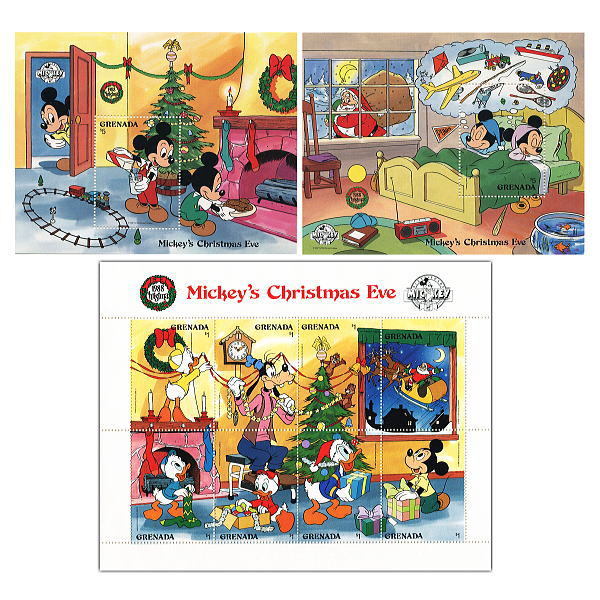 - ディズニー ミッキー ドナルド 切手/小型シート2枚&切手8枚1シート(ミッキーのクリスマスイヴ) 発行国Granada 1988年発行 新品