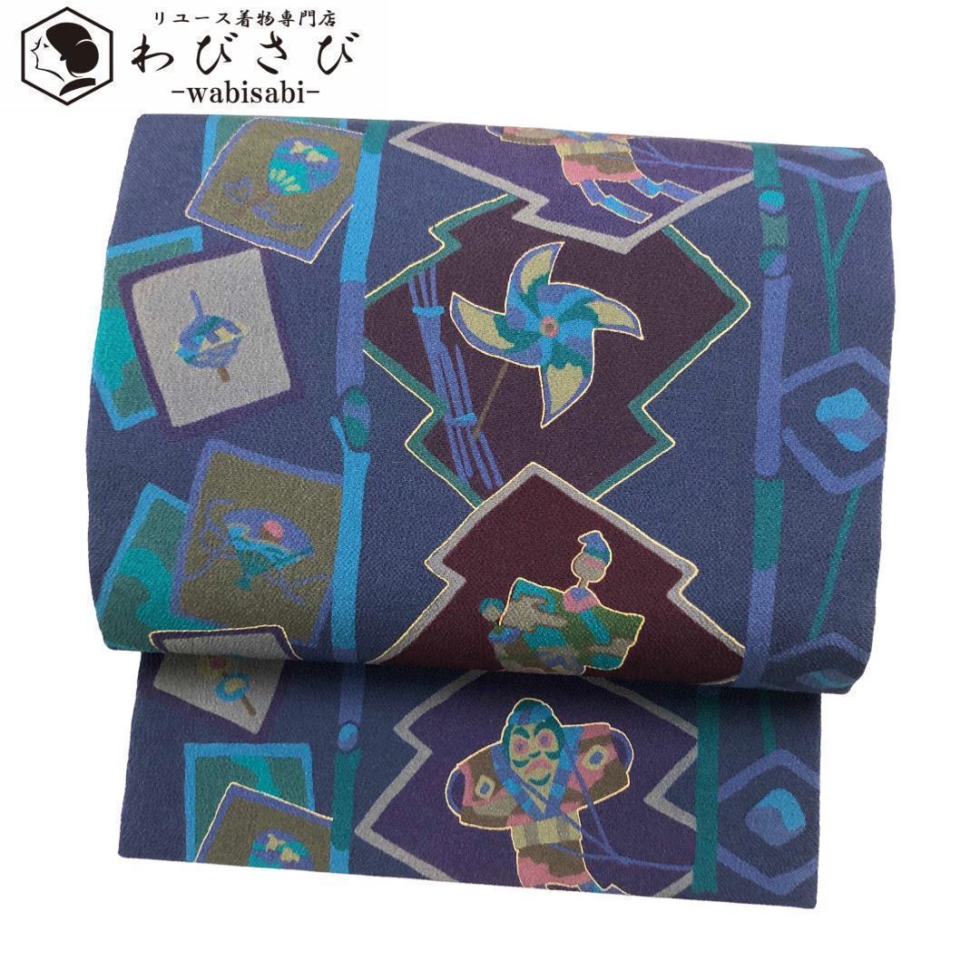 - 名古屋帯 和玩具柄 風車 でんでん太鼓 凧 縮緬 長尺 O-1970