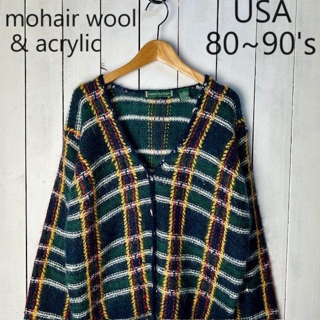 - USA古着 80s~90s チェック柄 モヘアウール×アクリル ニットカーディガン M~L 緑 オールド ヴィンテージ モヘアカーディガン ●246