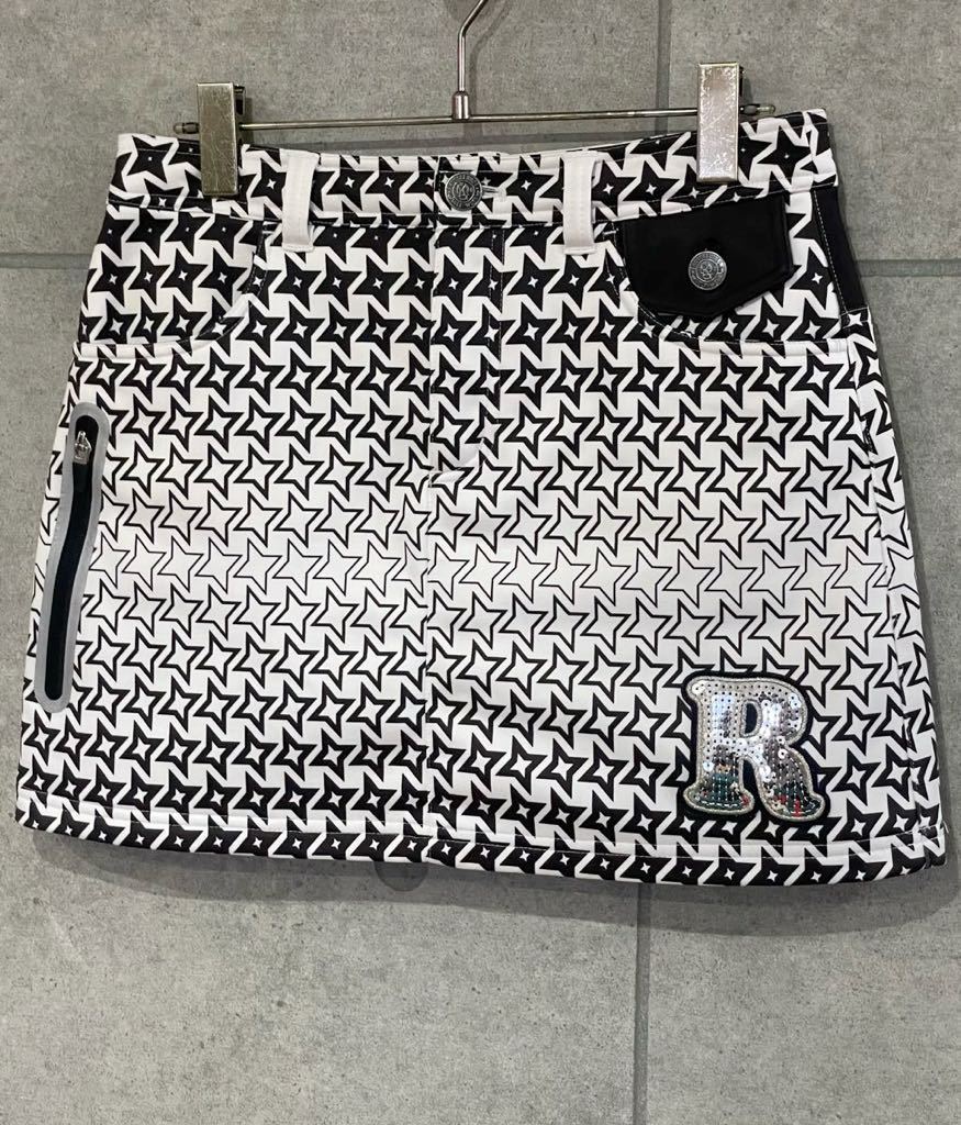 > 大人気! RUSSELUNO ラッセルノ スパンコール 星柄 総柄 ストレッチ スカート レディース ホワイト系 1サイズ ゴルフウェア ○ 新規×