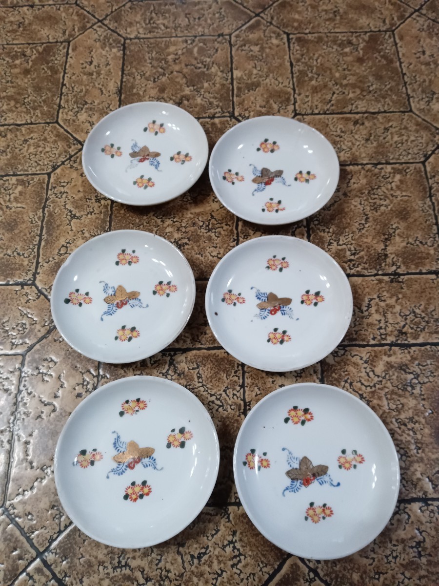 > 【旧家の蔵から】昭和中期 6客揃え 手描きの小菊と金彩小模様小皿 陶器 日本製 懐石料理 日本料理 |014924