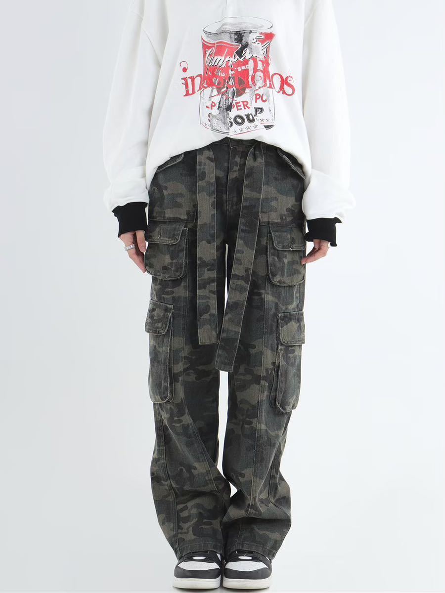 > デニム ワイドレッグ ジーンズ ワイドパンツ ワイドデニム ルーズパンツ ボトムス パンツ メンズ レディース ベルト付き 迷彩 M