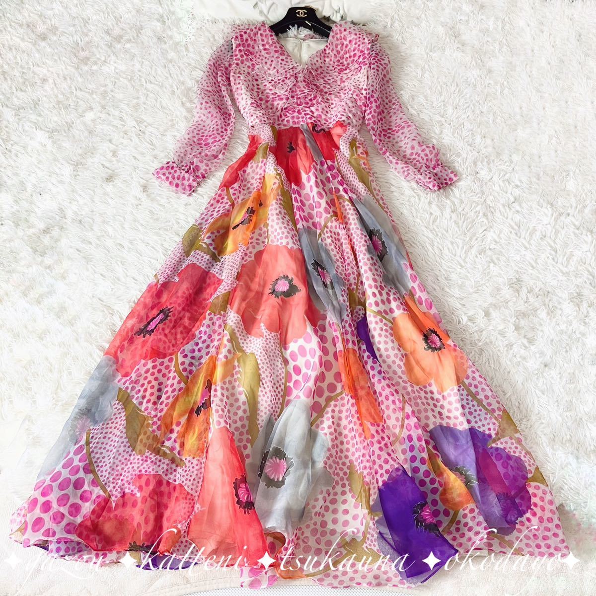> ヴィンテージ 古着 花柄 総柄 フラワープリント ロング マキシ フレア Aライン ドレスワンピース シースルー フリル パーティー ピンク