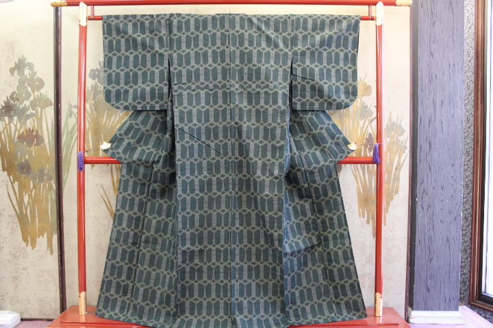 > きもの今昔6398 単衣のきもの 広衿セブセ付き手縫い単衣仕立て 濁りの緑地色に崩し亀甲の絣柄 身丈156cm