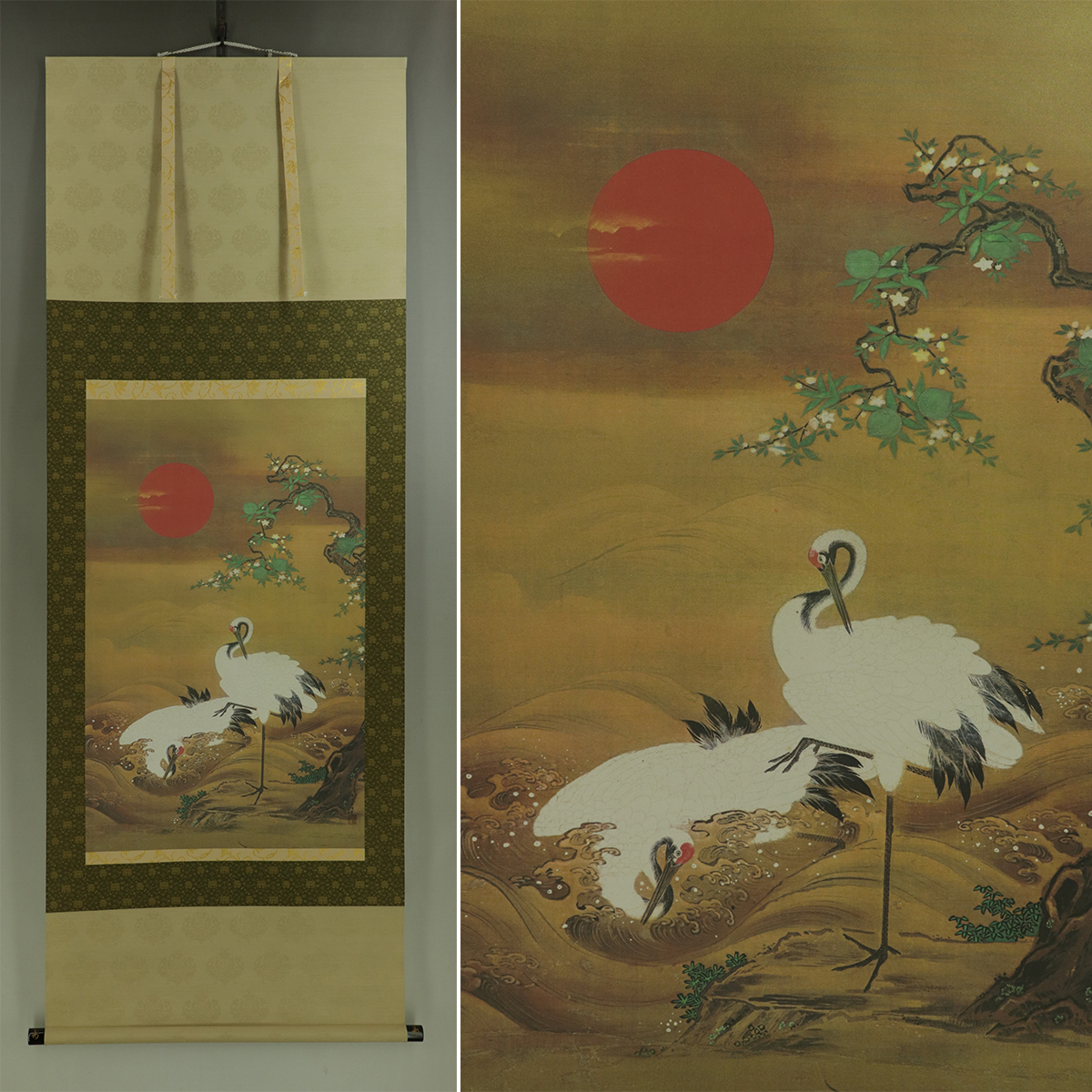 - 【巧芸】狩野房信【鶴図】◆絹本◆共箱◆二重箱◆掛軸 u10213