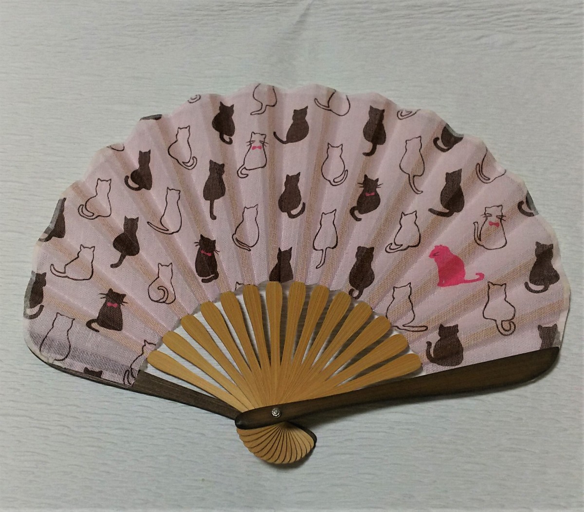 - 6263 手拭い扇子 *猫いっぱい* ピンク