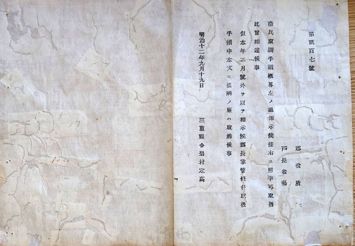 - f23072801〇明治布告布達 戸長に於いて 徴兵取調手続 度会県 三重県 明治12年〇和本古書古文書