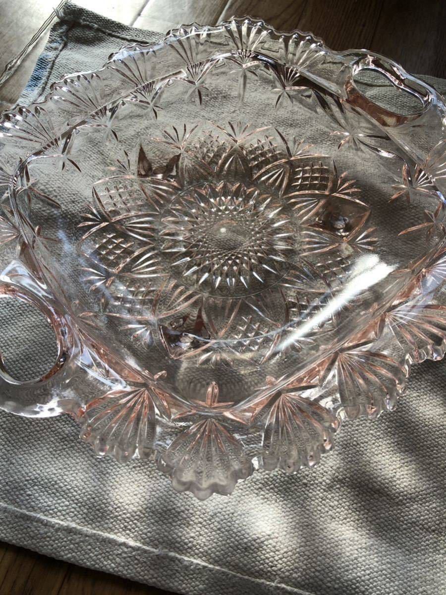 > ひまわり ピンク ガラス大皿1枚 小皿2枚 昭和レトロ★未使用品 High quality Japanese glass platter with sunflower pattern