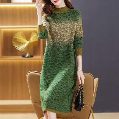 - 【グリーン&ベージュ色★Lサイズ】長袖 ひざ丈 ニットワンピースおしゃれ