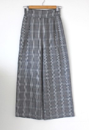 - 美品*グレー×黒×茶*チェック柄*ウエスト後ゴム*ポケット*ロング*ワイドパンツ*ウエスト64-70*M*レディース