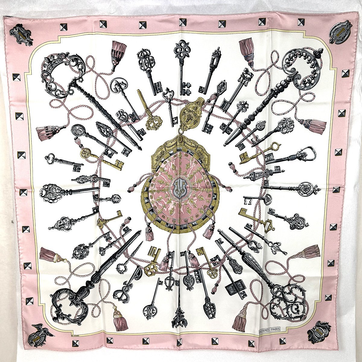 > エルメス カレ 90 スカーフ シルク100% ピンク系 鍵柄 小キズあり 送料無料 【B3】 HERMES SILK フランス製 長期保管品 中古