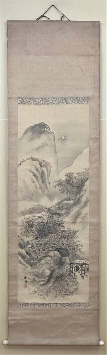 > E393●『模写』泰国【風景画】山水図 水墨画 絹本 日本書画 掛軸 在銘 落款 サイズ:約54.4㎝ x 191.5㎝
