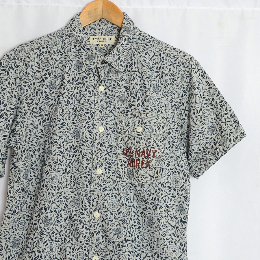 > AA475 アヴィレックス AVIREX アロハ 半袖シャツ M 肩43 フラワーシャツ TYPE BLUE メール便可 xq