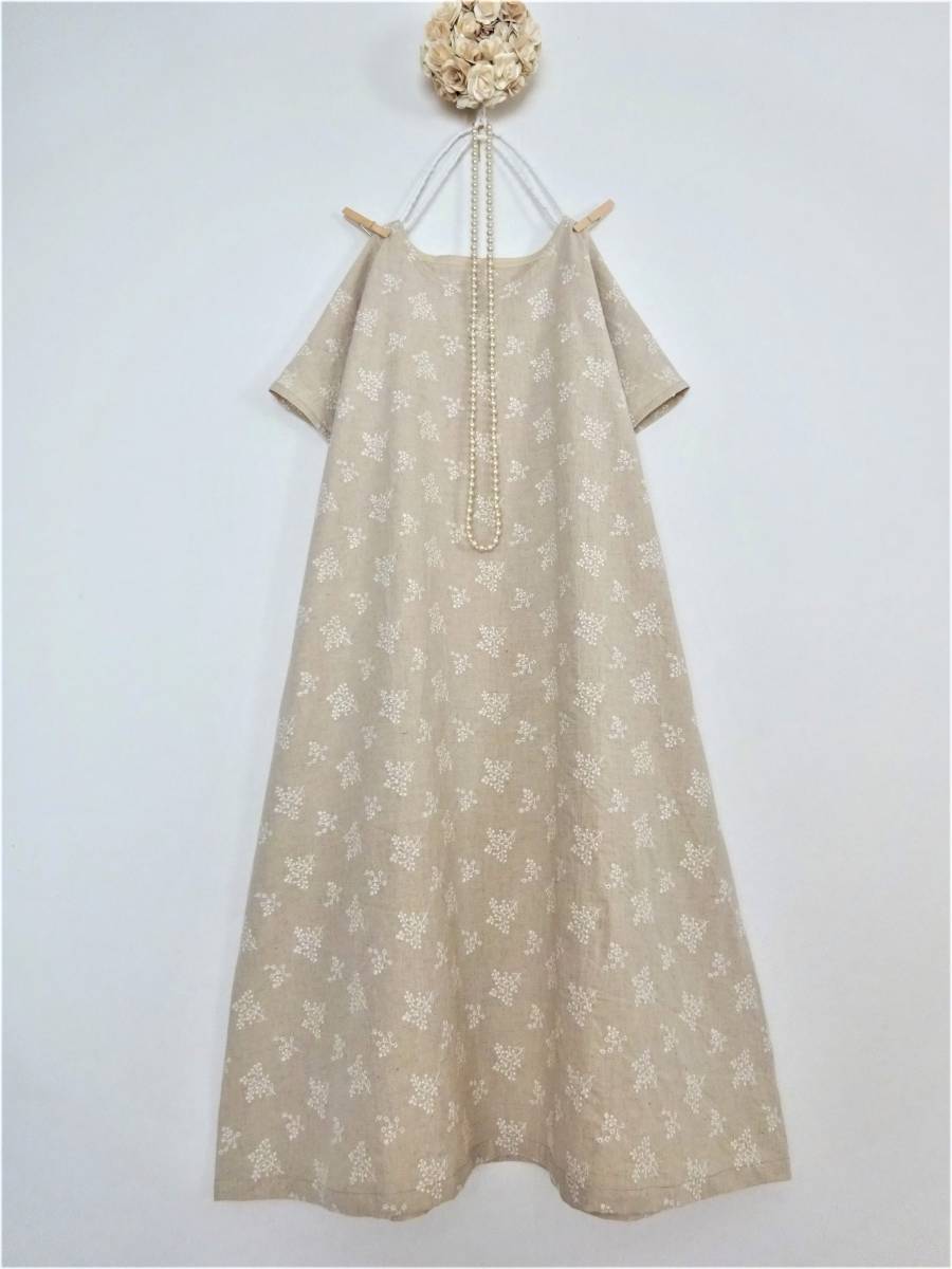 - 着丈オーダー◆総刺繍「かすみ草」コットンリネンのAラインワンピース◆綿麻 花柄 ハンドメイドop フリーサイズ