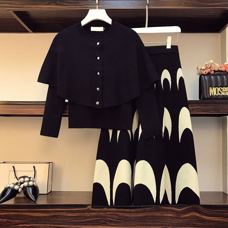 - レディース ツーピース スカート スーツ ワイドドレープ マント ボタン 黒 M~4XL DJ590
