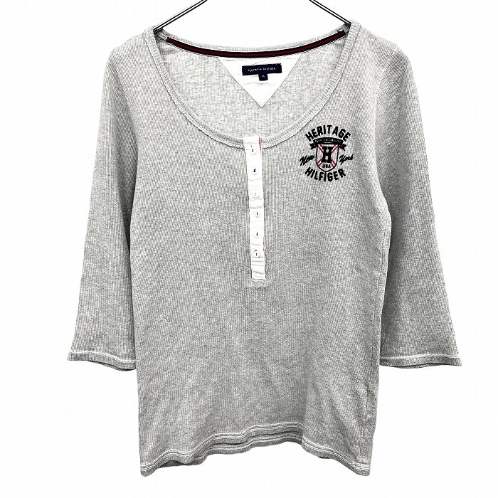 - TOMMY HILFIGER リブカットソー ストレッチ Uネック ヘンリーネック 刺繍 7分袖 綿100% M 杢グレー 杢グレー×紺×赤×白×緑 レディース