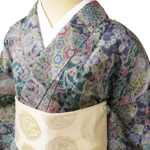 > 小紋 着物 中古 正絹 袷 カジュアル 花模様 纐纈 地模様 緑系色 紫系色 多色 身丈166cm 裄66.5cm L トール きもの北條 A984-2