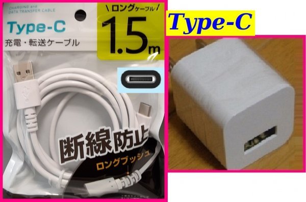 - 【送料無料:2点:USBケーブル (1.5m)+ACアダプタ タイプC】★断線防止★ホワイト/白★ACアダプタ スマホ 携帯:充電 ケーブル:充電器:充電
