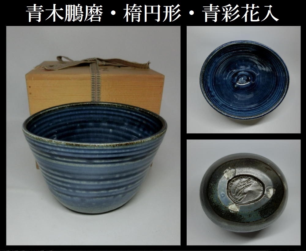 - 【真作保証】青木鵬磨・楕円形・青彩花入