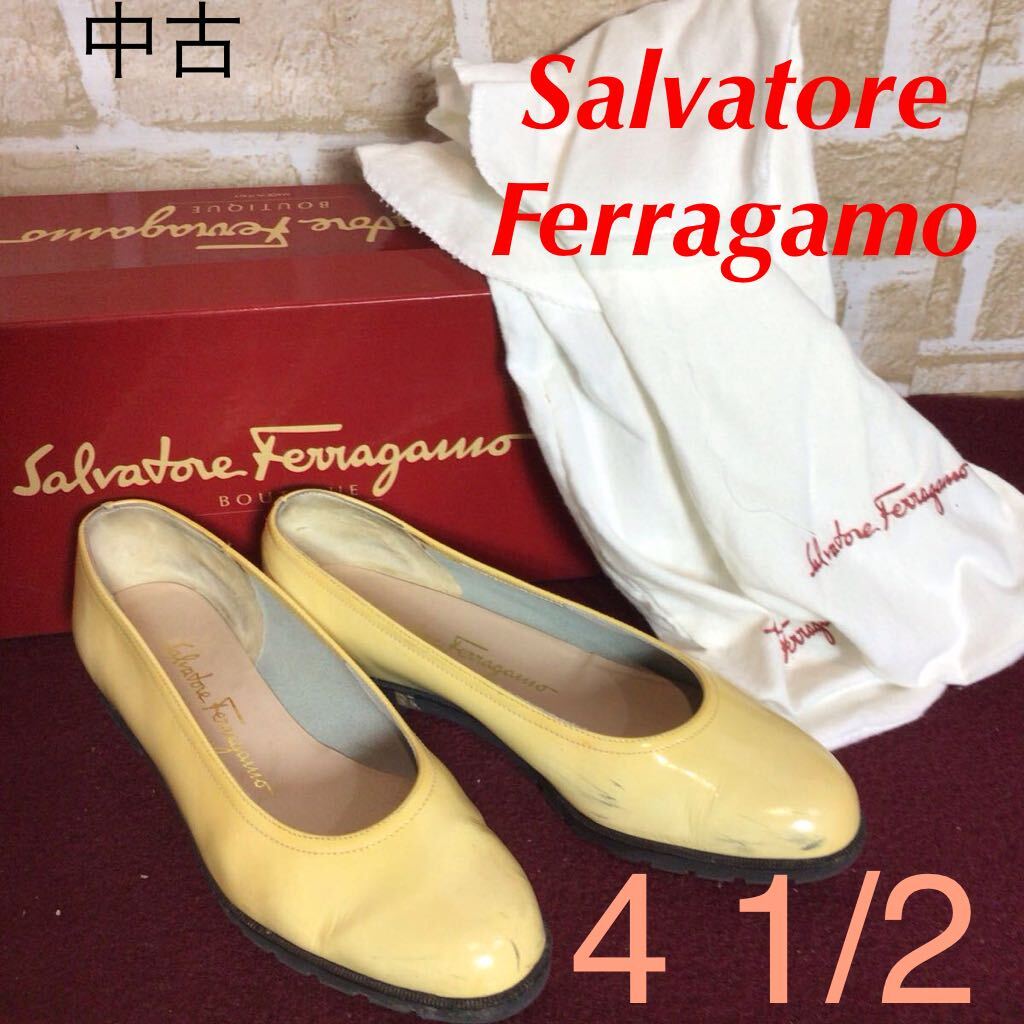 > 【売り切り!送料無料!】A-354 フェラガモ !パンプス!イエロー!パステルイエロー!4 1/2 21.5cm位!フラットシューズ!ローヒール!箱付き!中古!