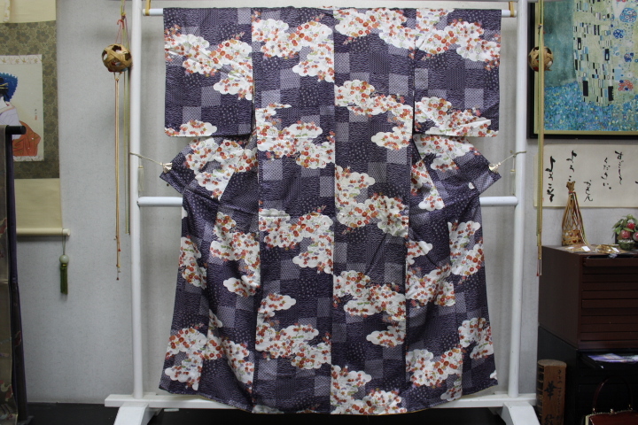 > きもの今昔6678 小紋のきもの 広衿袷手縫い仕立て 正絹りんず地紫市松小紋様地 雲取りに四の花 身丈156cm