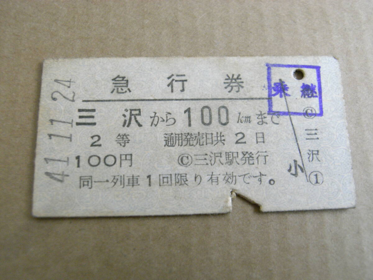 - 急行券 三沢から100kmまで 2等 昭和41年11月24日 三沢駅発行 国鉄