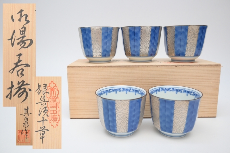 - 湯呑 ■賞美堂 有田焼 其泉 湯呑揃 [ 銀呉須十草紋 /銀 染付/内側 蜻蛉] 5客■煎茶器 料亭 小料理 割烹 栞 木箱入り 帝国ホテル№9578-5■