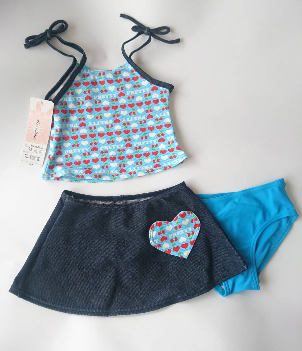 > Moon Shot セパレート 水着 3点セット ブルー 110cm 女の子 タンクトップ スカート ハート チェリー さくらんぼ デニム ポケット