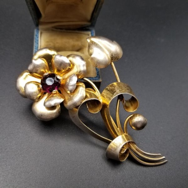 > 1940年代 AT刻印 大ぶりの花 曲線美 アールヌーヴォー 925 シルバー ヴィンテージ ブローチ ゴールドトーン 銀細工 フローラル 紫石 YNT24