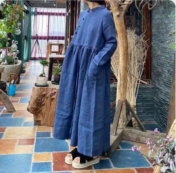 - lgn 1722 ロングワンピース ステンド衿 アンティーク風 洋服ミックス ロマンファッション ポップ 麻100% リネン ブルー