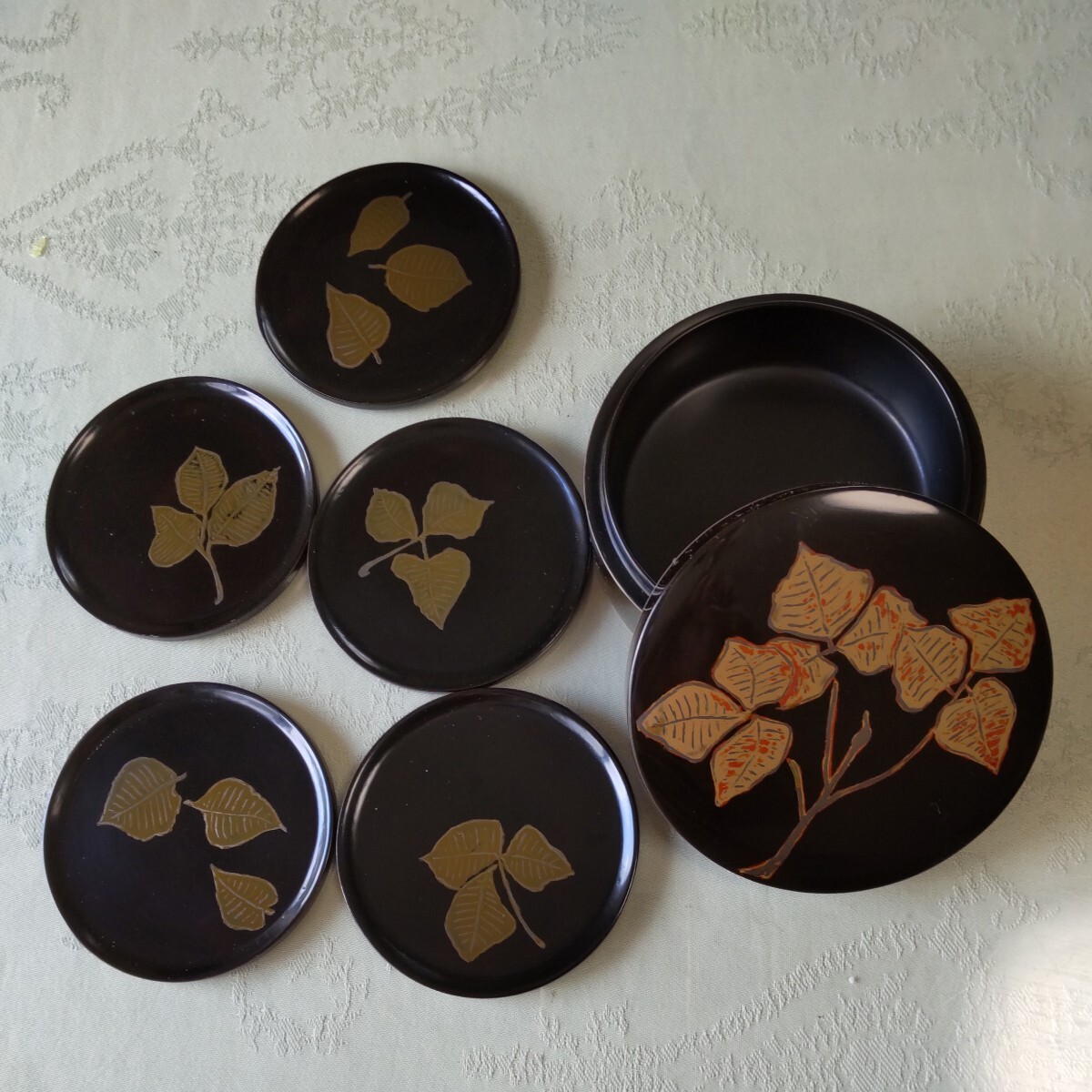 - 木製漆器 茶托 五客 手描き 絵変わり 漆絵 小物入れ 茶托収納器 煎茶 ビンテージ 高級収納器と茶托セット 保管美品